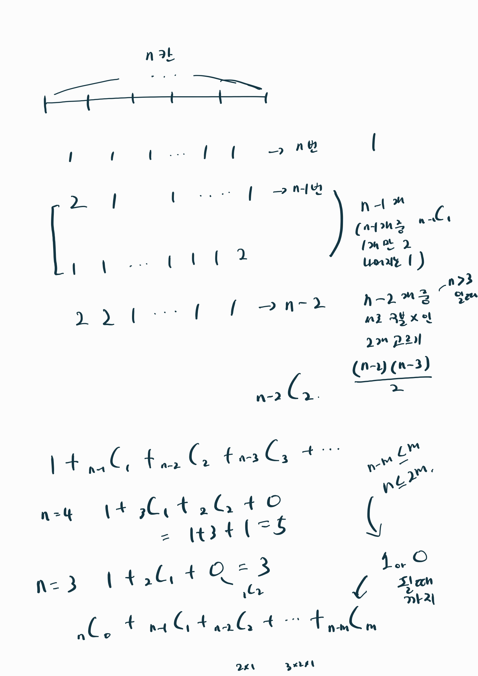 코드에서 fib(n+1)을 했는데 n이 아니라 n+1을 한 이유는 피보나치 수열은 1, 1, 2, 3… 이렇게 나열되는데 칸 뛰어넘는 방식은 1, 2, 3, …로 2번째 수부터 시작하기 때문에 보정해주기 위해 +1 해주었다. 위에 올린 링크에서는 칸이 아닌 계단으로 했는데 결국 대상만 다르지 수로 바꾸어 생각하면 둘 다 같은 내용이기에 혼동할 필요도 없을 듯하다.