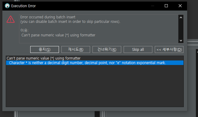 - csv파일 import 임폴트 에러 (Can't parse numeric value [*] using formatter)